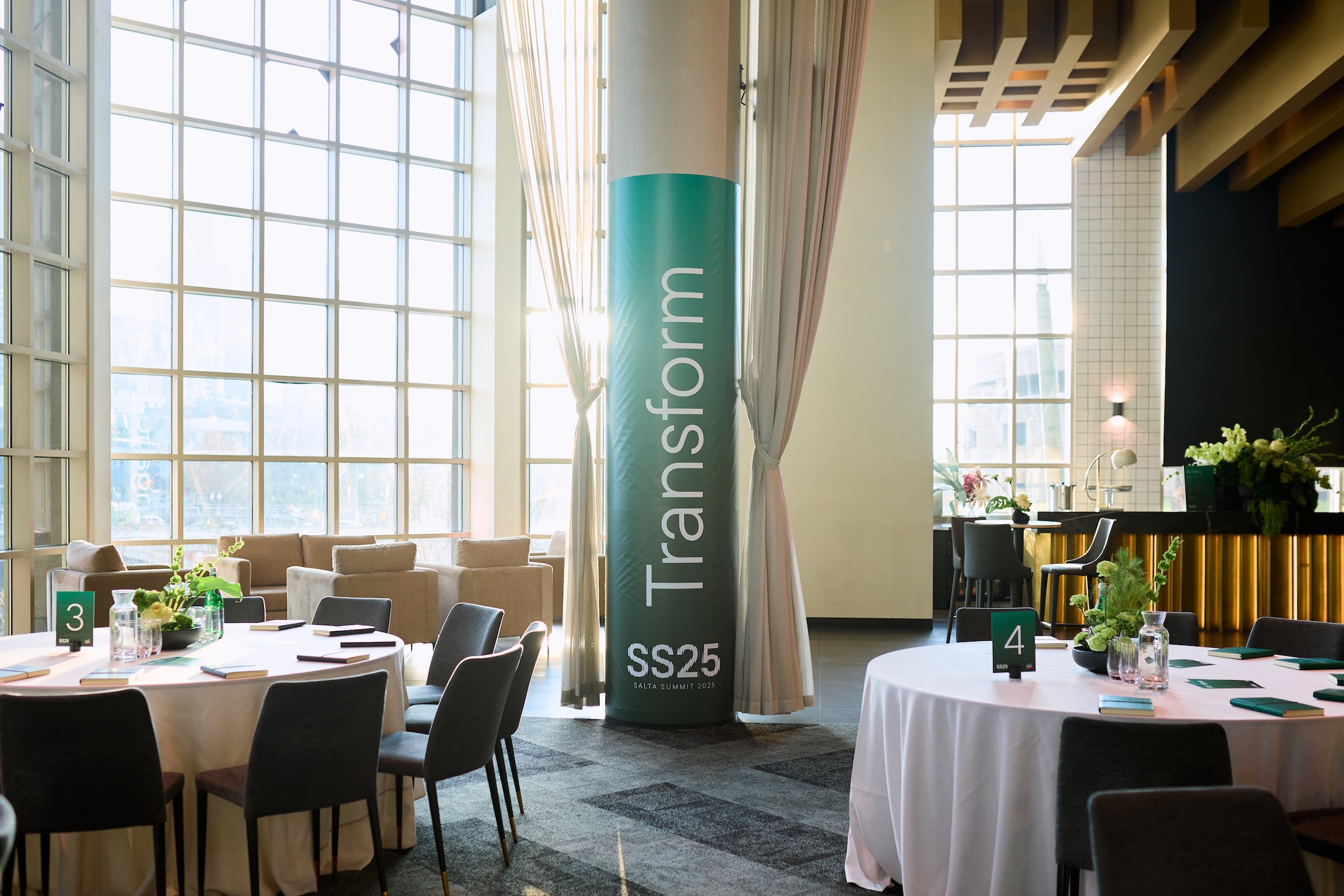 Emerald tones, sleek branding, greenery and modern table settings created a sophisticated yet vibrant atmosphere, with bold signage on soaring columns reinforcing the themes Transform, Engage, Connect. The space struck a balance between focus and connection, featuring round tables with pebble linens, fresh green centrepieces, agenda cards and thoughtful details to encourage collaboration.