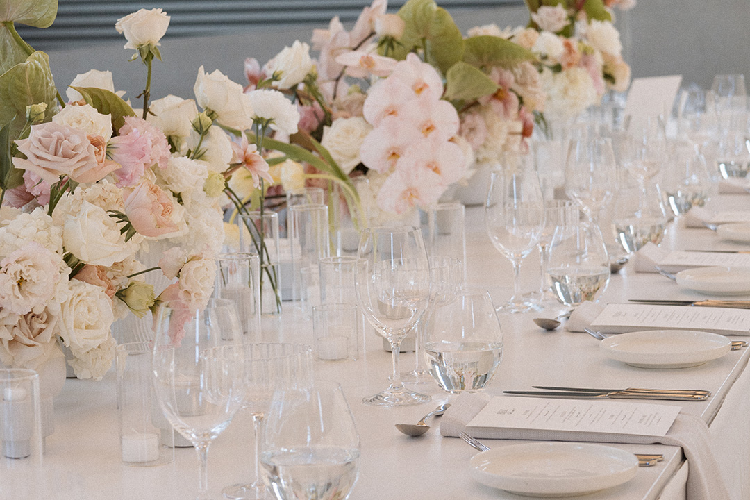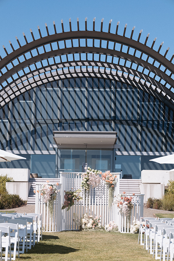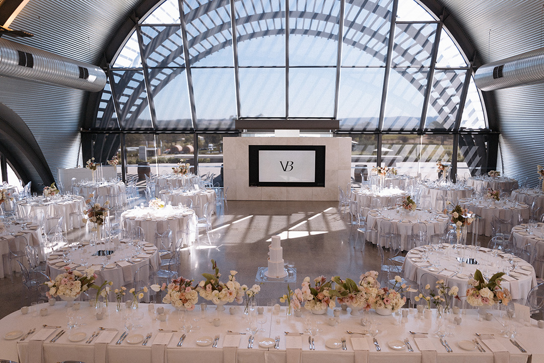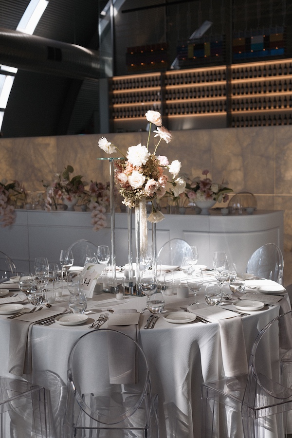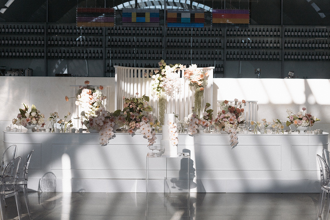 Set against the stunning backdrop of Levantine Hill in Coldstream, their wedding was designed as a modern love story brought to life. The brief: elegant, romantic, soft and contemporary- with a palette of dusty pinks and warm whites setting the tone. A sculptural ceremony arbour, blending linear and curved elements, echoed the venue’s striking architecture and the reception continued this refined aesthetic, featuring soft linens, statement florals in linear vases, and a beautifully styled bridal table and backdrop.