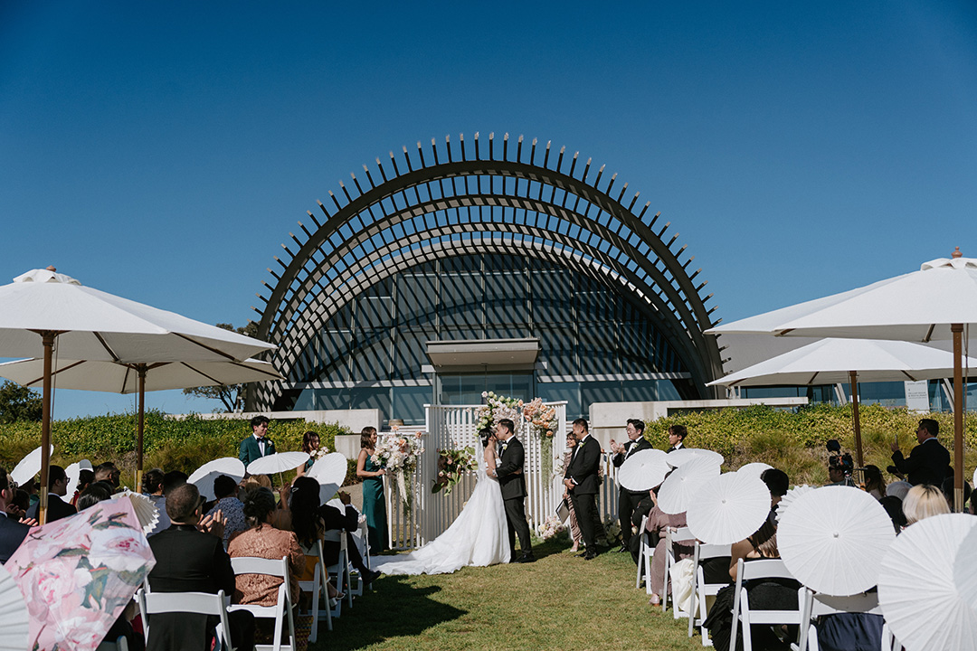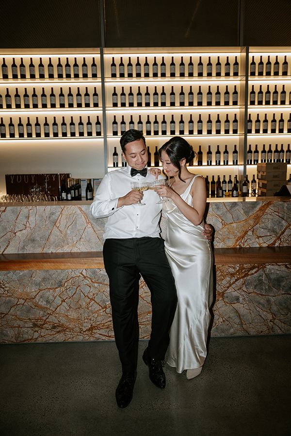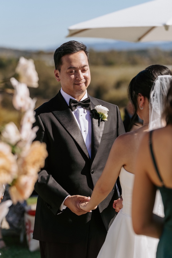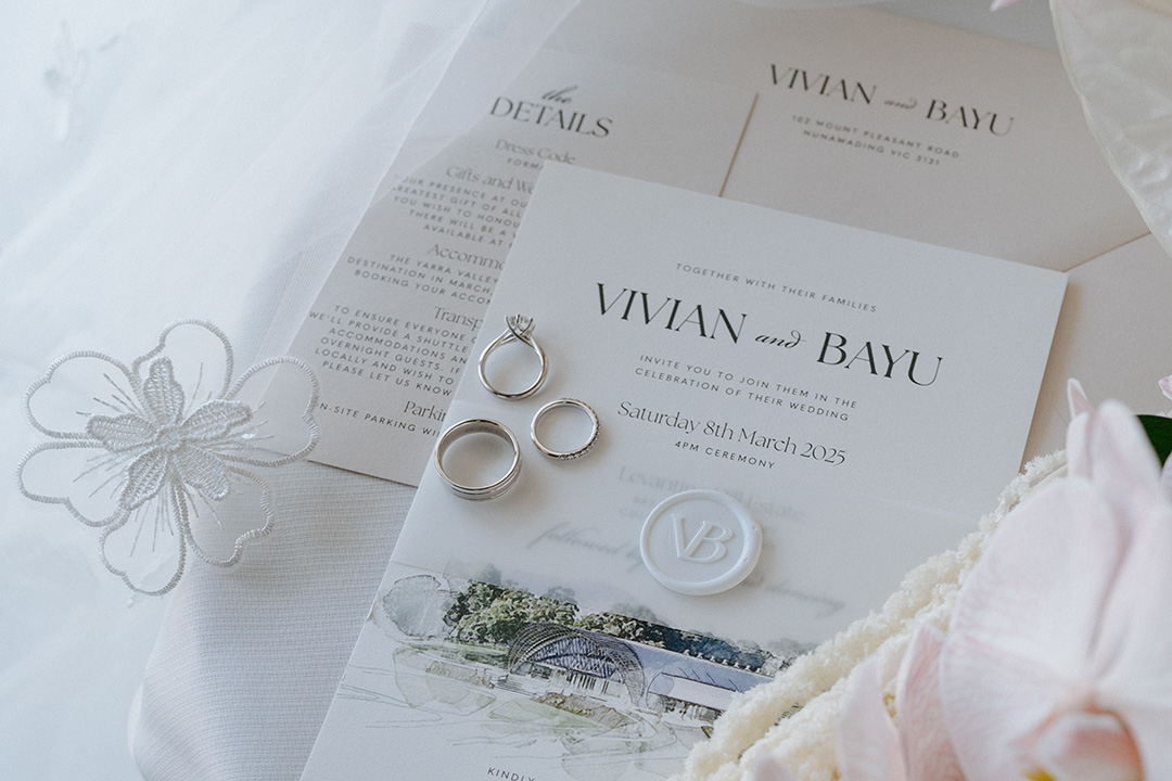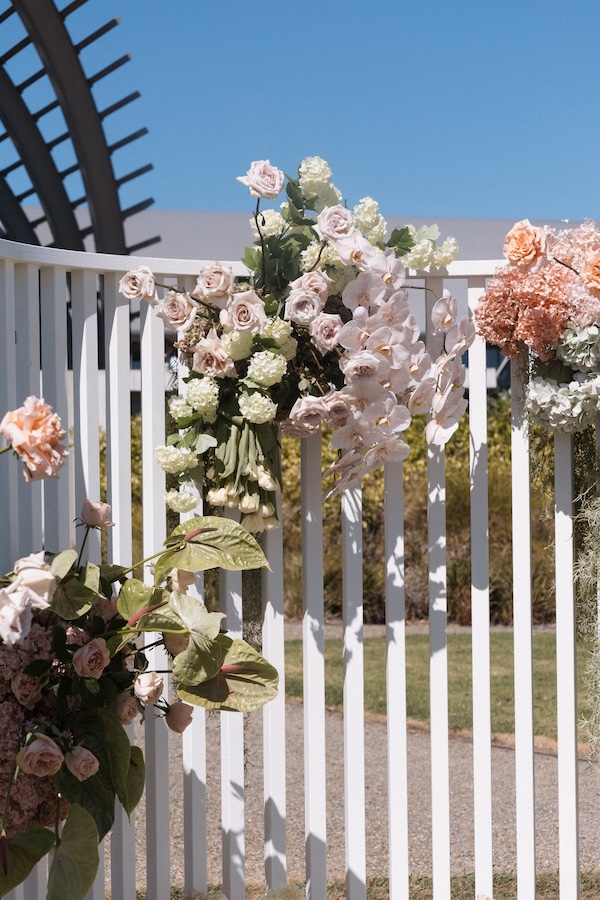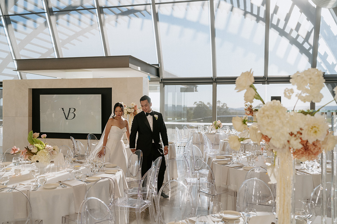 Set against the stunning backdrop of Levantine Hill in Coldstream, their wedding was designed as a modern love story brought to life. The brief: elegant, romantic, soft and contemporary- with a palette of dusty pinks and warm whites setting the tone. A sculptural ceremony arbour, blending linear and curved elements, echoed the venue’s striking architecture and the reception continued this refined aesthetic, featuring soft linens, statement florals in linear vases, and a beautifully styled bridal table and backdrop.