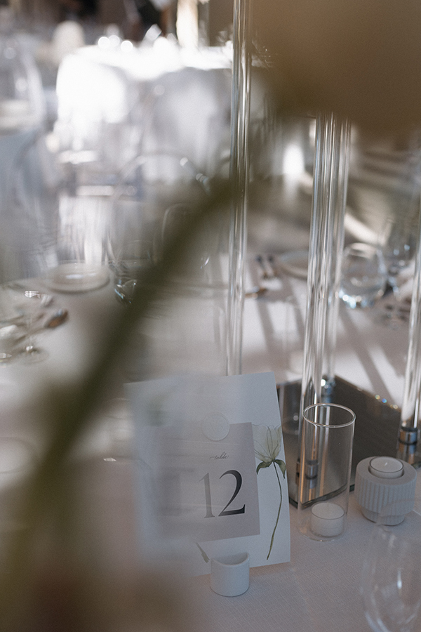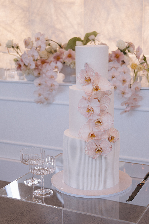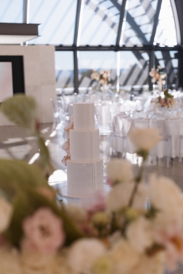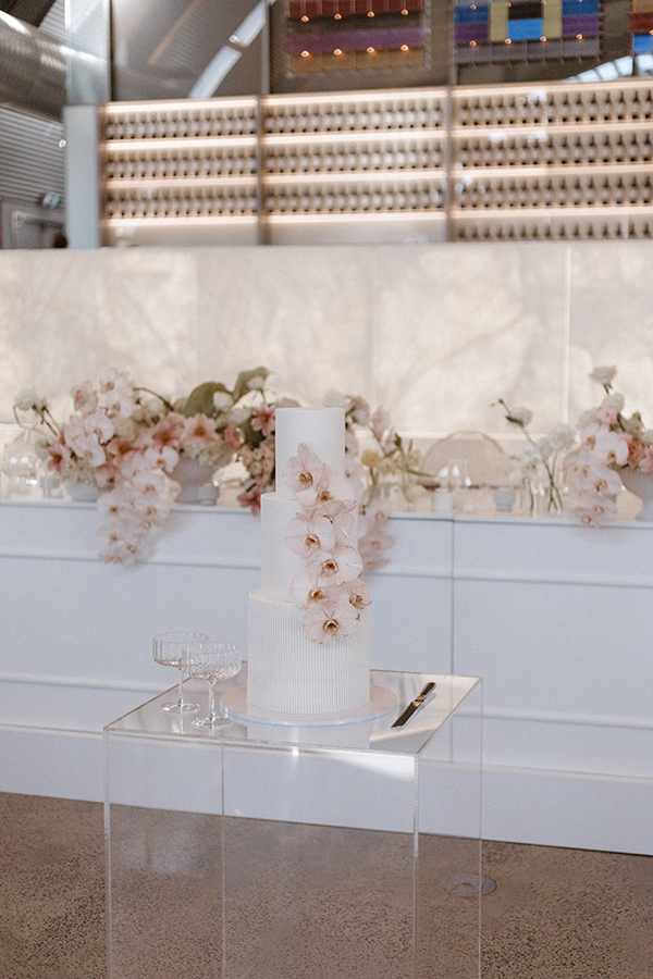 The cake, a sleek centrepiece, mirrored the architectural lines of the day’s design.