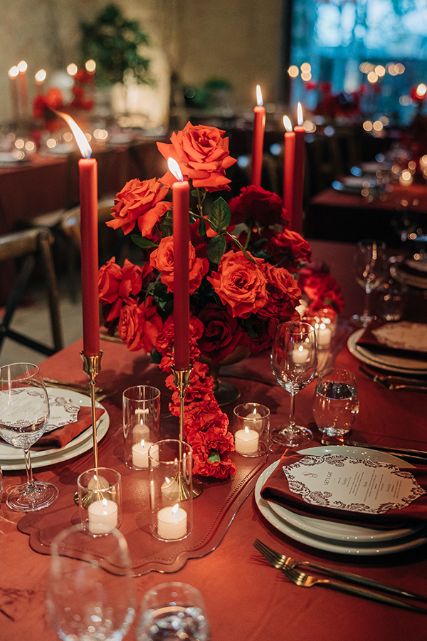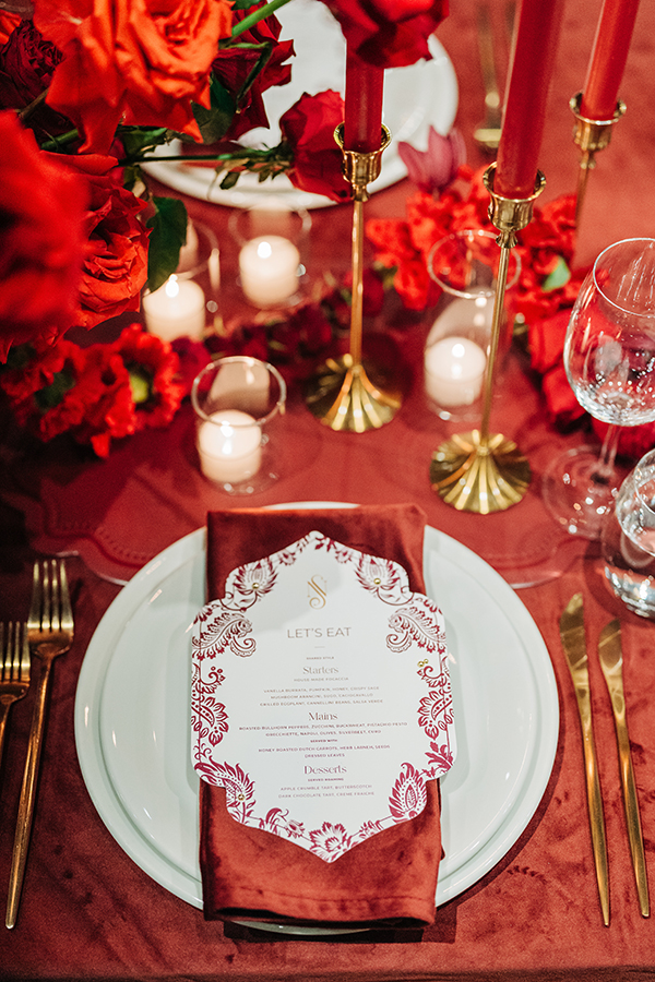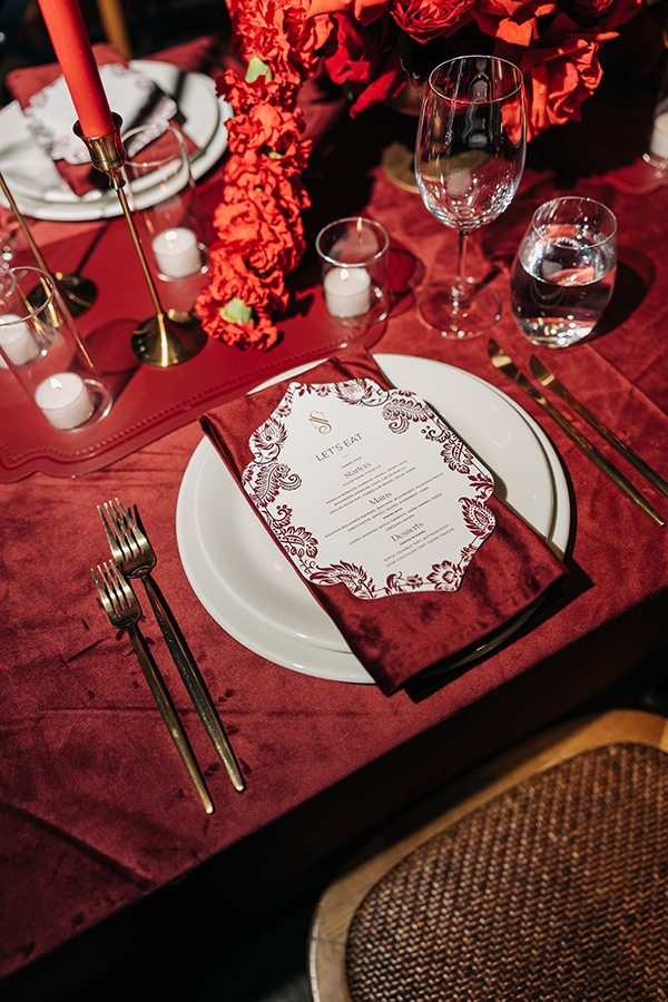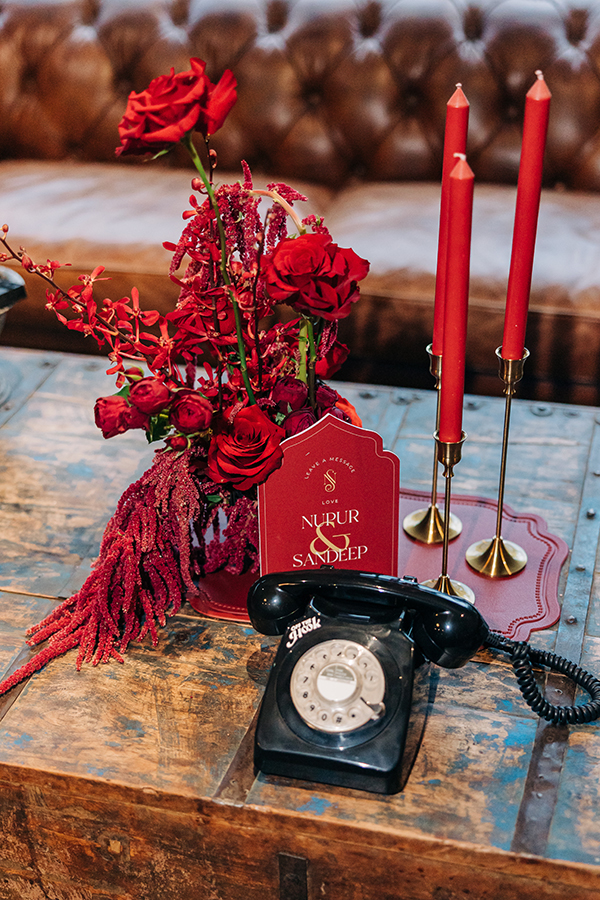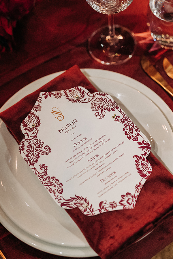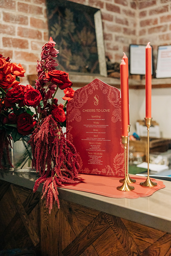 The Sangeet – An intimate, luxurious evening of candlelight, candelabras, velvet textures, deep red roses – and of course, dancing! Family and friends took the dance floor with heartfelt lively performances.